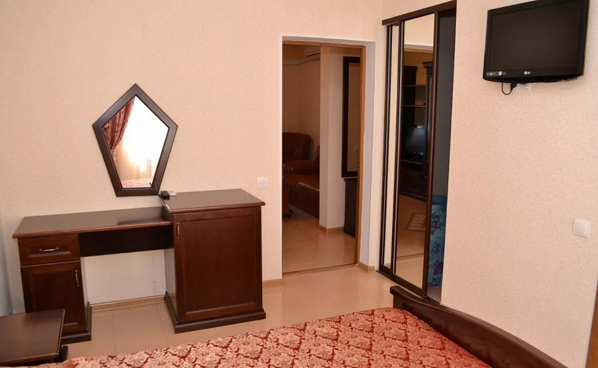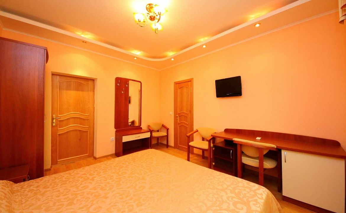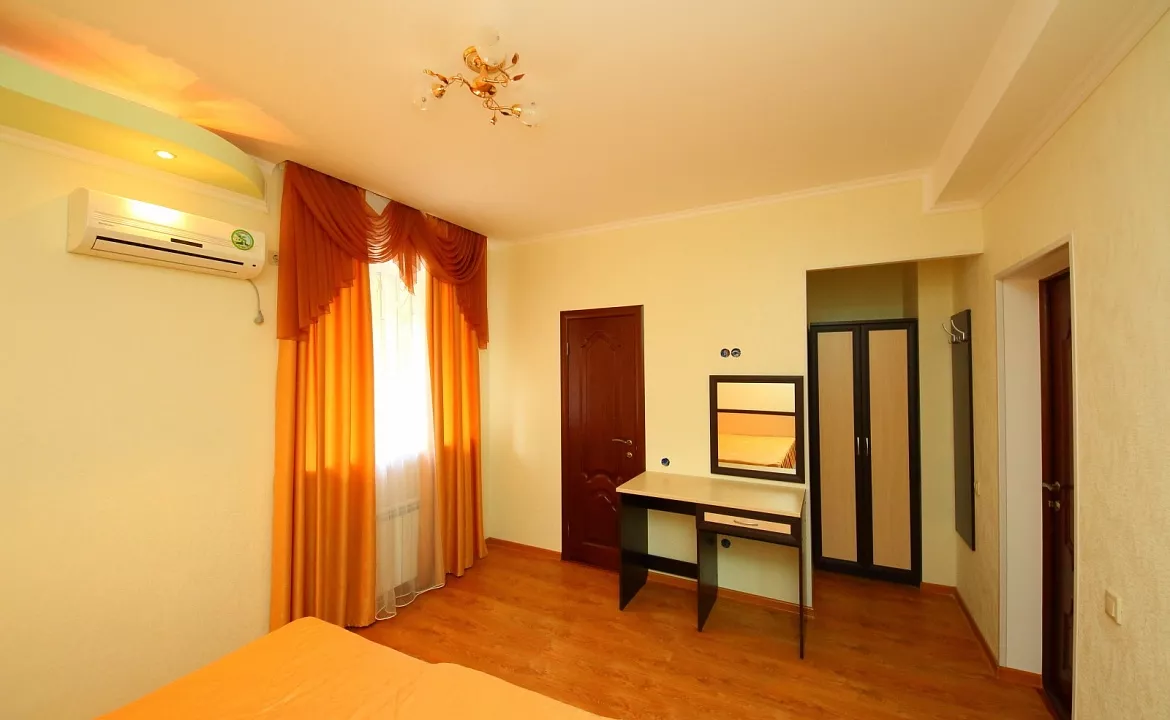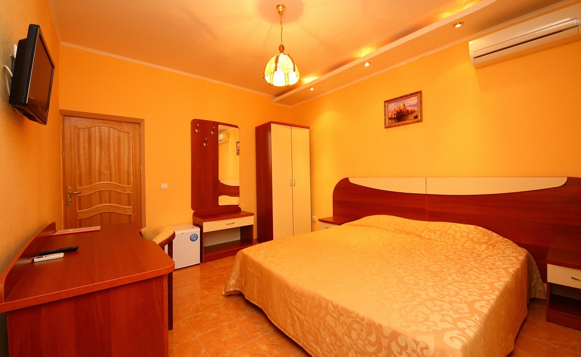 Мебель: двуспальная кровать, стулья, шкаф, прикроватные тумбочки, туалетный столик, вешалка, зеркало. Удобства: кондиционер, холодильник, телевизор.