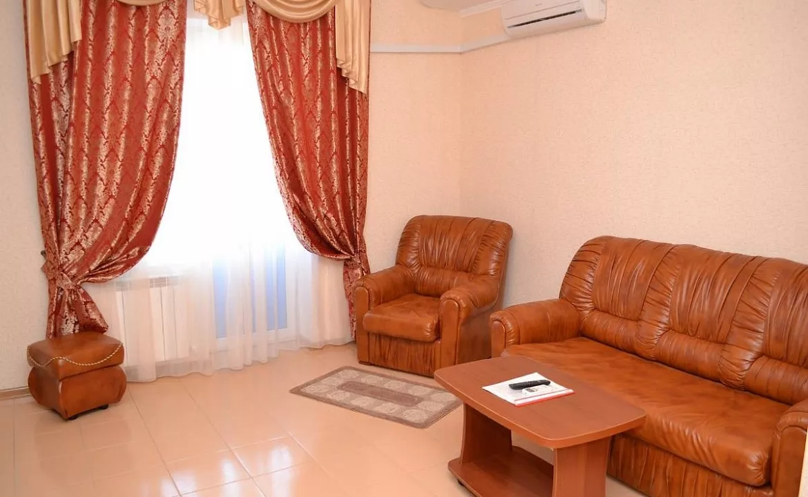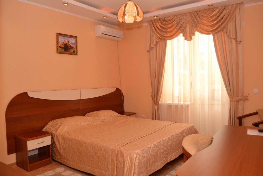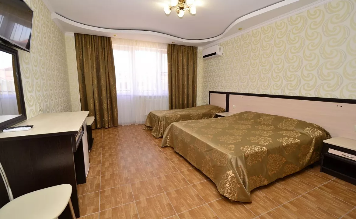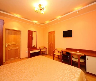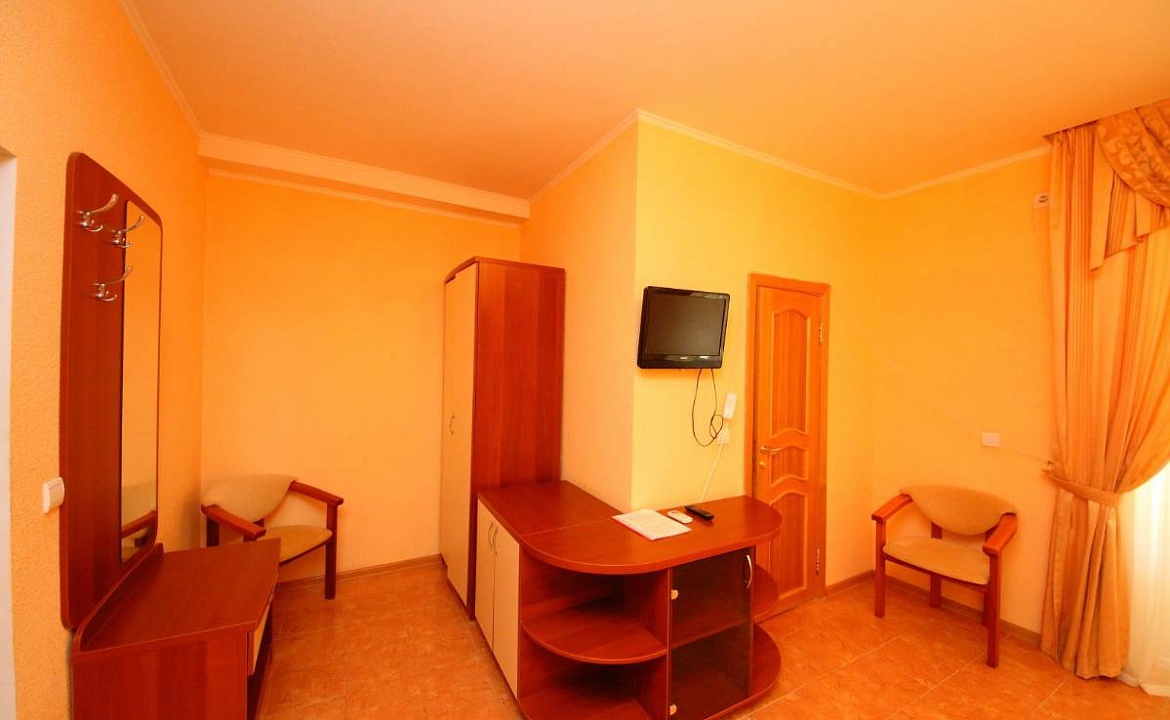 Мебель: двуспальная кровать, стулья, шкаф, прикроватные тумбочки, туалетный столик, вешалка, зеркало. Удобства: кондиционер, холодильник, телевизор.