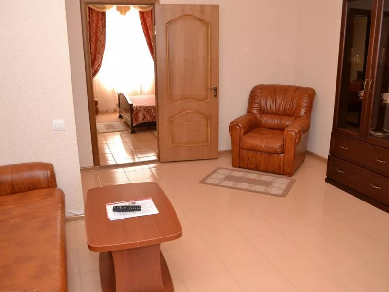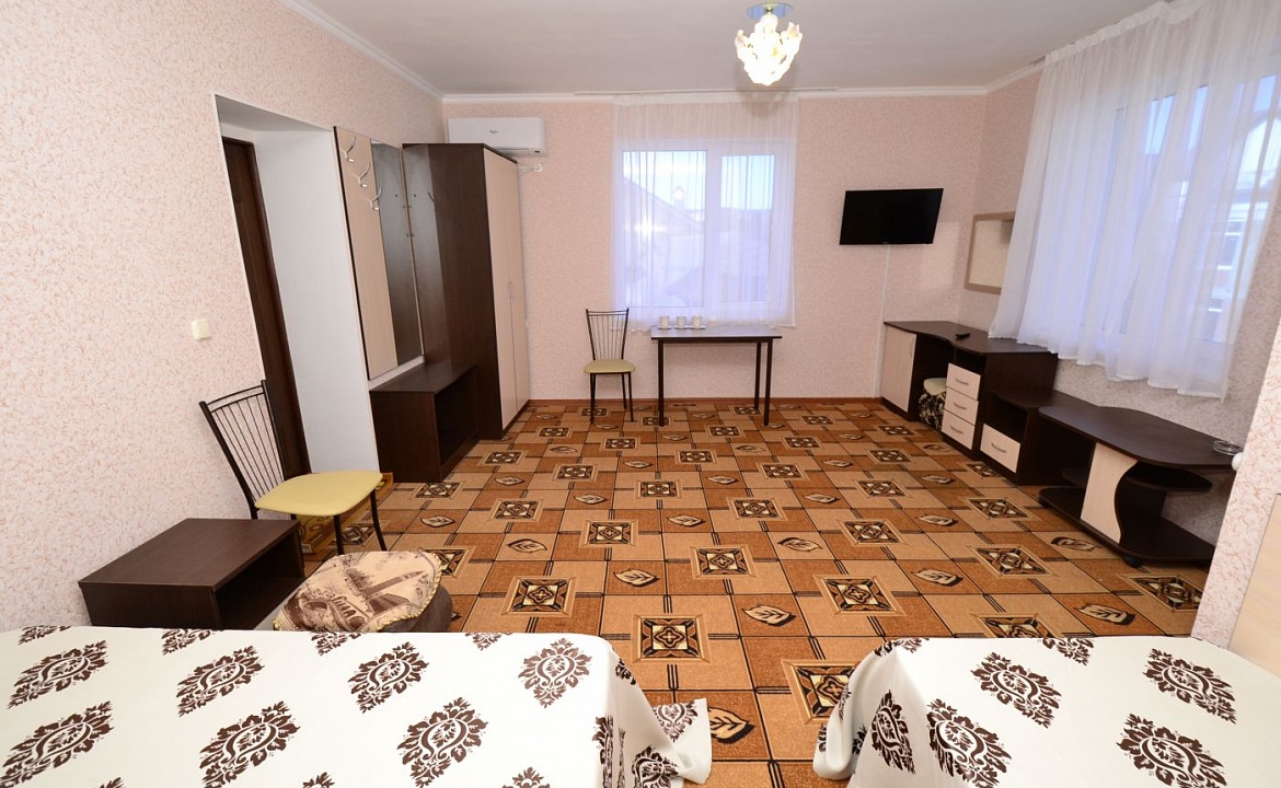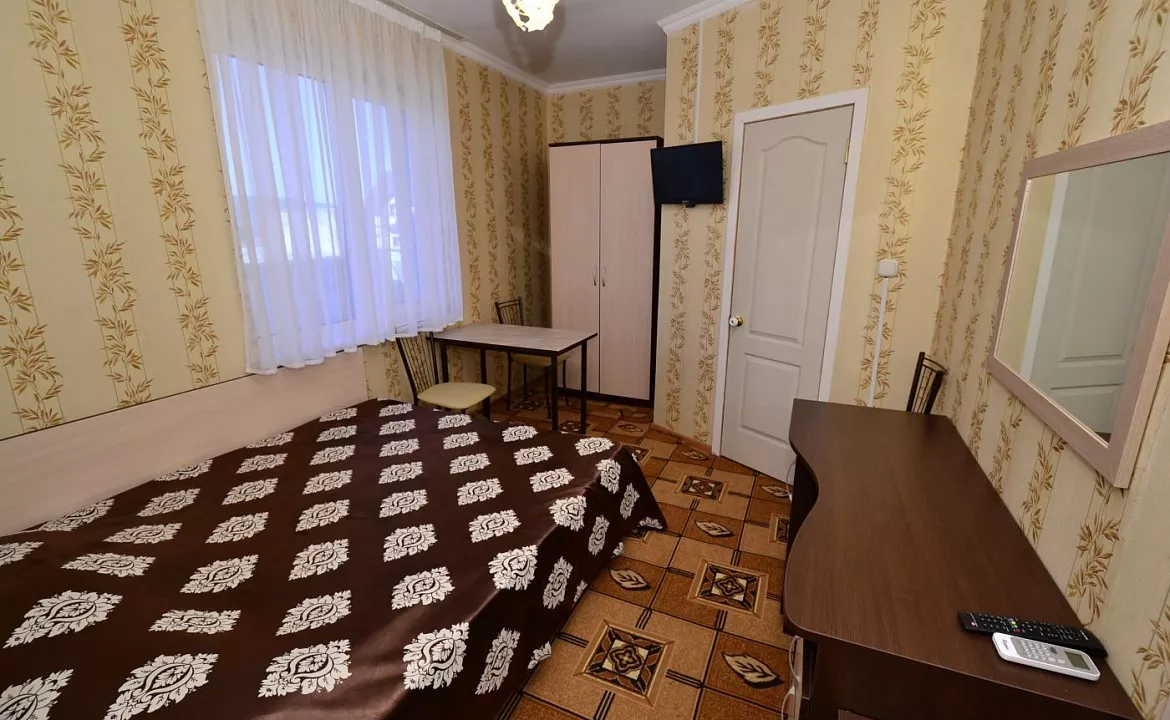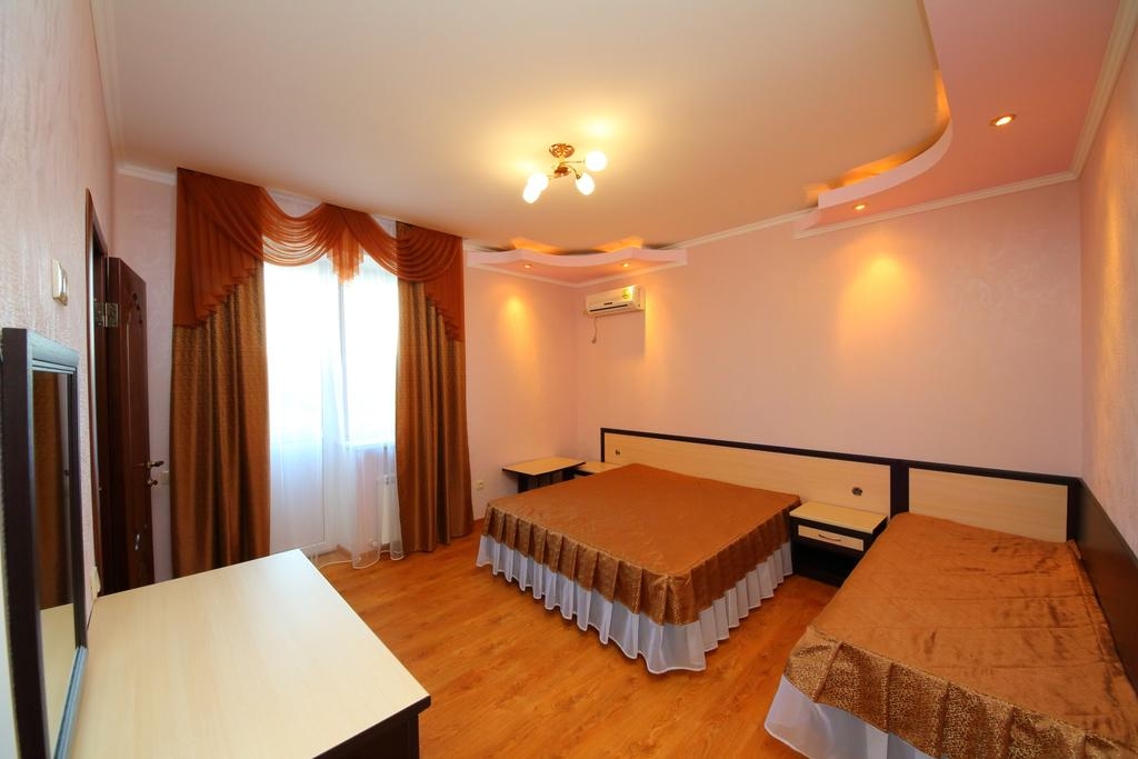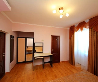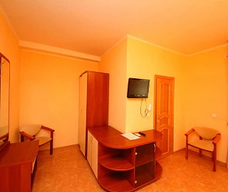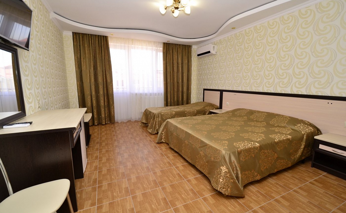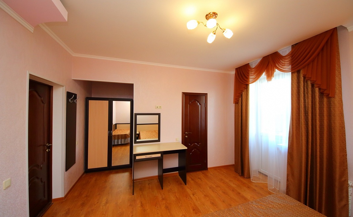 Мебель: односпальная и двуспальная кровати, шкаф, прикроватные тумбочки, журнальный столик, туалетный столик, комод, вешалка, зеркало. Удобства: кондиционер, телевизор, холодильник, балкон (наличие уточнять).