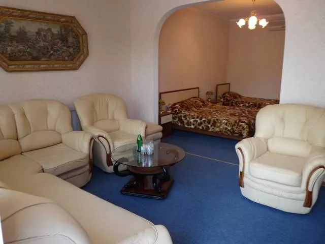 Мебель: односпальные или двуспальная кровати, диван или кресла, стулья, шкаф, прикроватные тумбочки, журнальный столик, вешалка, зеркало. Удобства: кондиционер, телевизор, холодильник, сейф, интернет, мини-бар.
