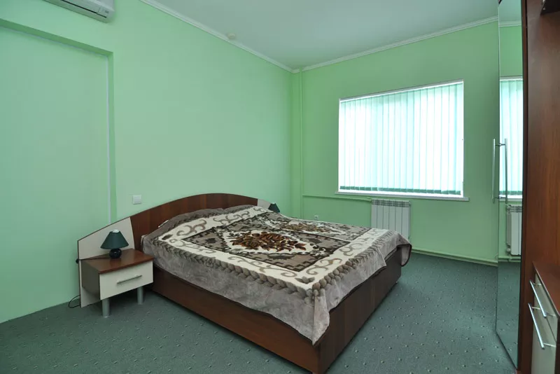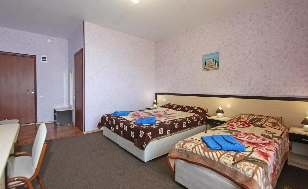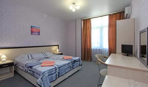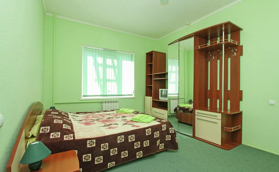 Мебель: односпальные или двуспальная кровати, шкаф, пуфики, прикроватные тумбочки, журнальный столик, зеркало. Удобства: кондиционер, телевизор, ТВ, сейф, интернет.