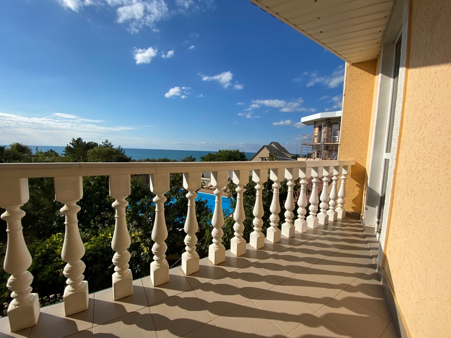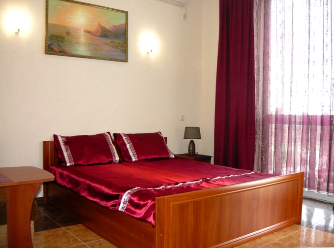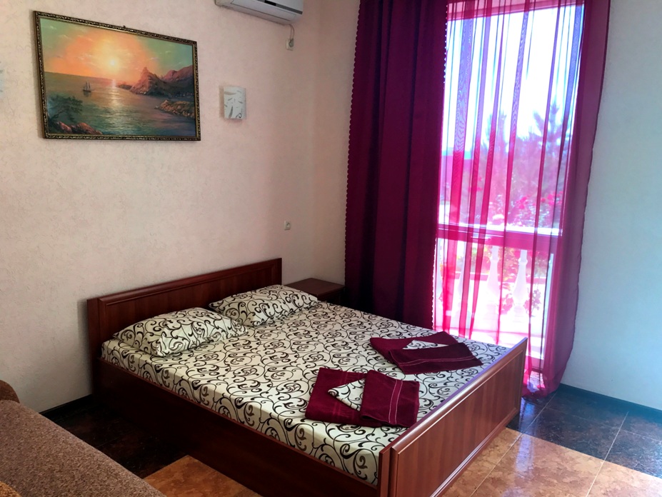 Номер расположен в новом трёхэтажном здании с прекрасным видом на море. В номере все удобства: кондиционер, душевая кабина, туалет, умывальник, холодильник, плазменный телевизор, горячая и холодная вода - круглосуточно; вся необходимая мебель: двуспальная кровать, шкаф с зеркалом, прикроватные тумбочки, туалетный столик, комод, журнальный стол, стулья.