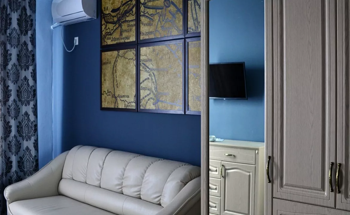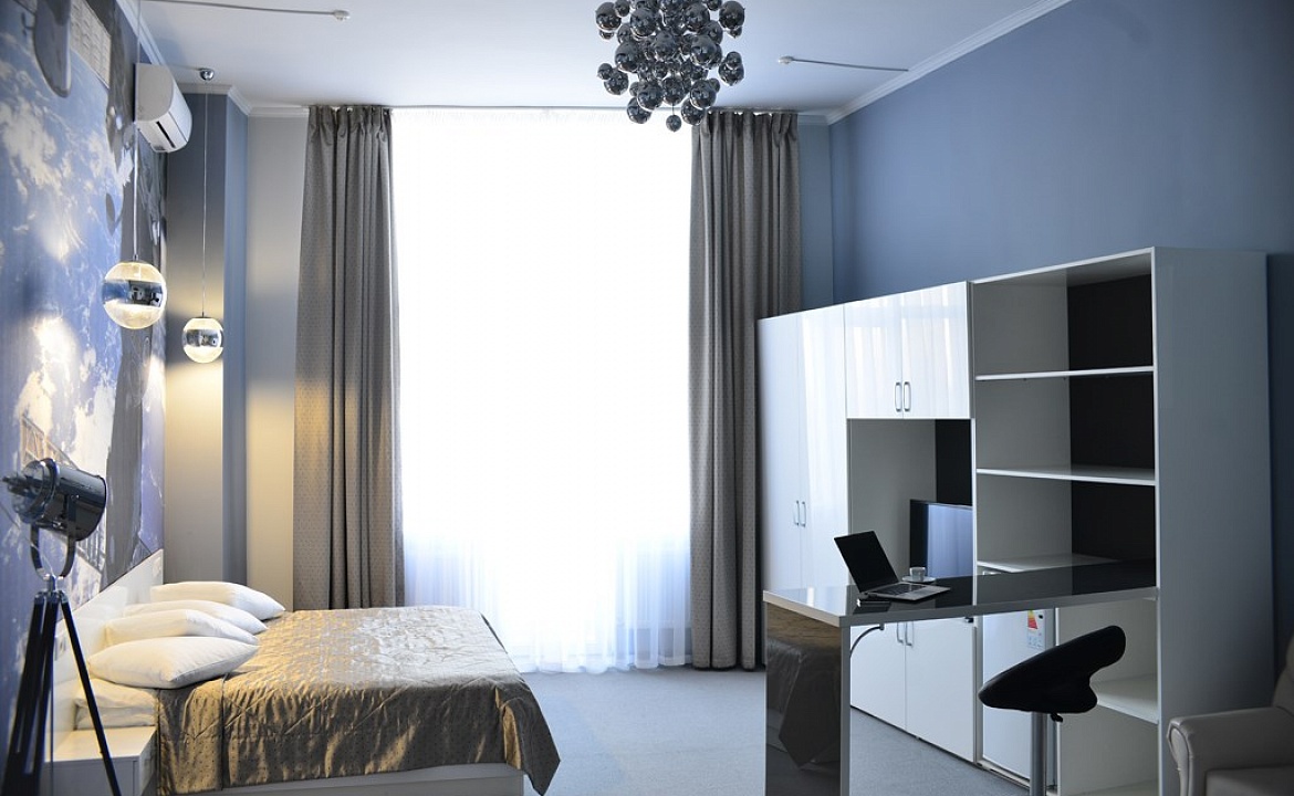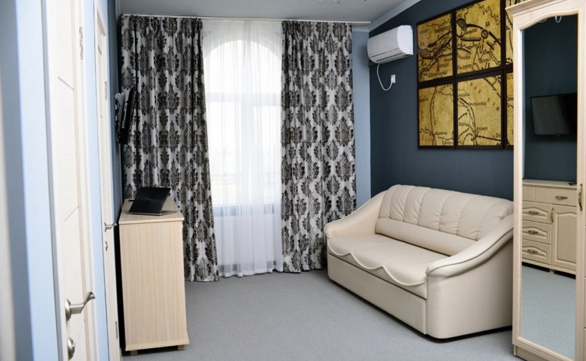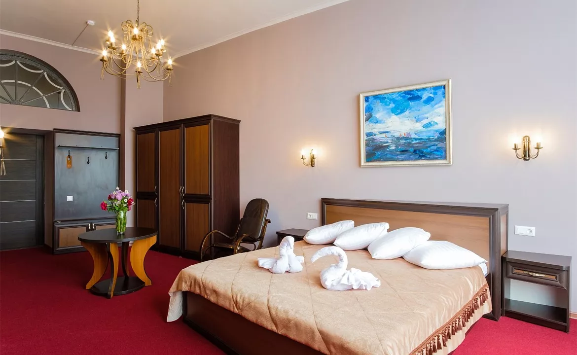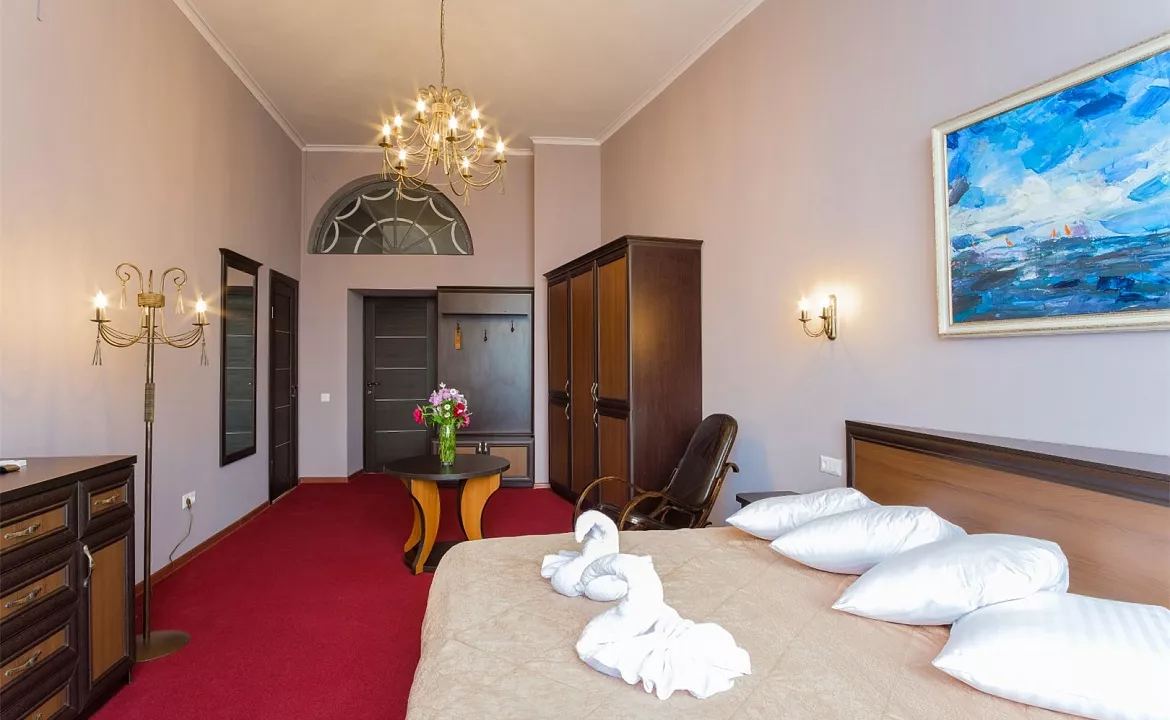 Однокомнатный номер, от 25 до 30 кв.м. В номере: двуспальная кровать, диван или кресло-кровать, шкаф, телевизор, холодильник, сейф, кондиционер. Санузел: ванна, туалет. Балкон/эркер с видом на набережную/во двор.