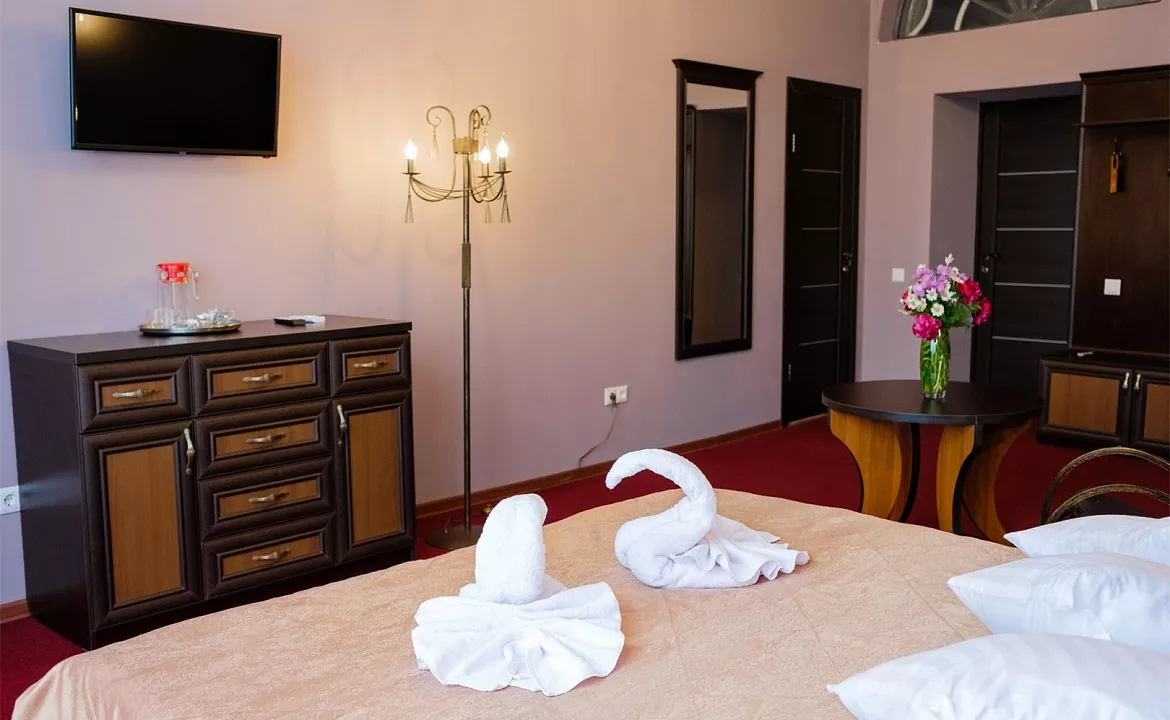 В номере: двуспальная кровать, диван, шкаф, журнальный столик, телевизор, холодильник, сейф, кондиционер, чайник.