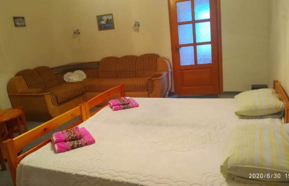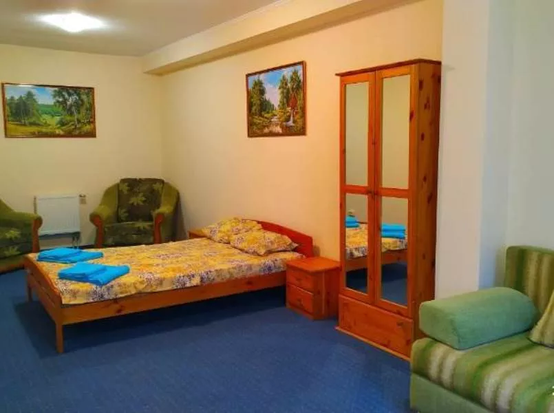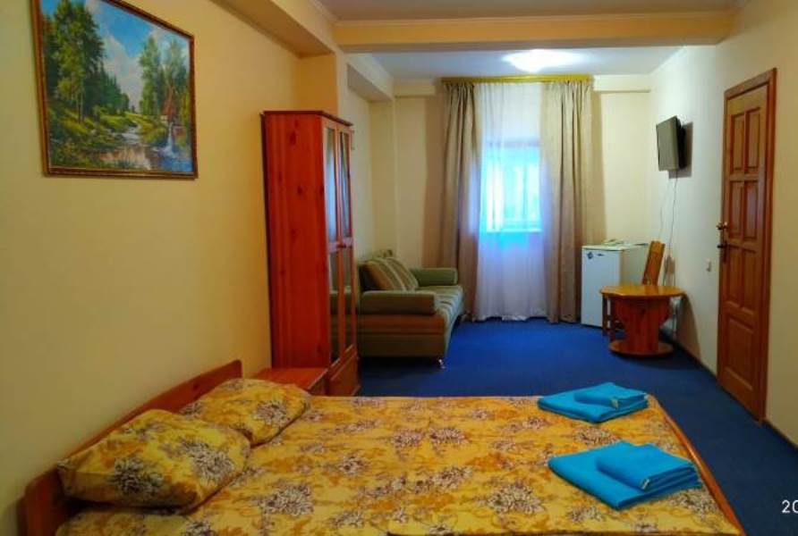 Мебель: односпальные и двуспальная кровати, диван-кровать, кресла, шкаф, прикроватные тумбочки, вешалка, зеркало. Удобства: кондиционер, холодильник, телевизор, спутниковое ТВ, СВЧ, эл. чайник, посуда, интернет, душевые принадлежности, гладильная + утюг