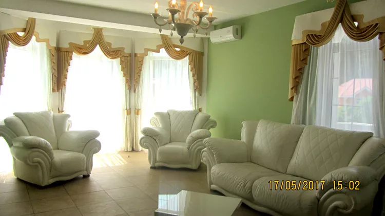 Номер Люкс - пятиместный. Три спальни (одна двуспальная кровать, три односпальные кровати), одна гостиная, один санузел. Две террасы с прекрасным видом на море и бассейн. Детям до 15 лет предоставляется дополнительное место бесплатно.