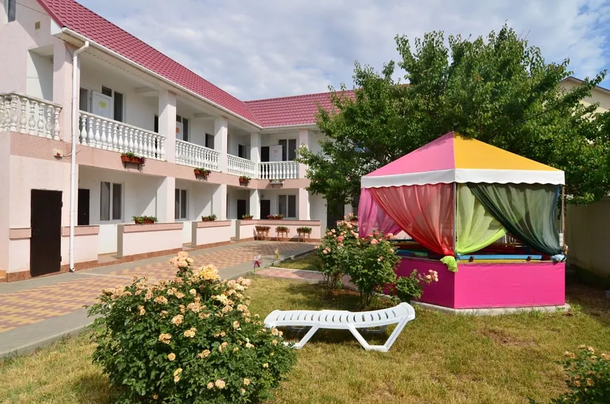 Пансионат семейного типа "Радуга" располагает частной обширной территорией. В её пределах располагаются уютная беседка для отдыха, мангал, детские качели.