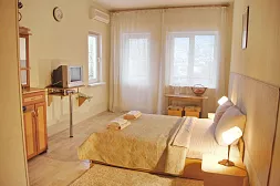 Из номеров с балконом открывается великолепный вид на зелень и горы. Мини-гостиница имеет автостоянку с видеонаблюдением и свой дворик, на котором наши гости могут воспользоваться мангалом. Желающим организуются различные экскурсии (ознакомительная-вводная, обзорная по ЮБК, пешеходная по старому городу, экскурсия на гору Кошку с остатками Генуэзской крепости и городища тавров и т. д. )